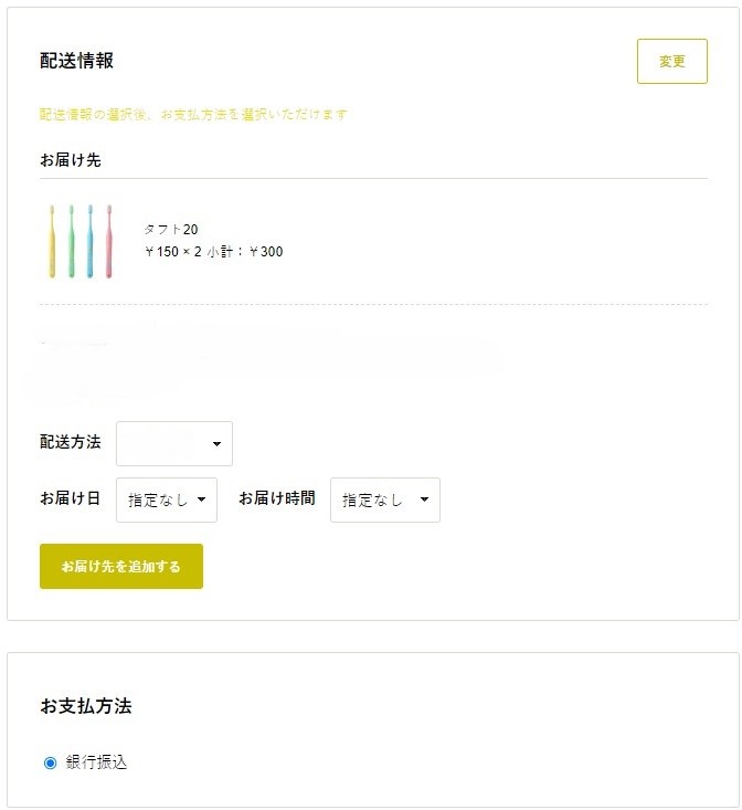 お届け先、配送方法、お届け日時、お支払い方法などを選択します。